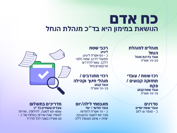 מניתוח שערכנו בכ-15 פרויקטים של שיקום נחל / הקמת פארק מבוסס מים, אנו מעריכים כי עלות התחזוקה והתפעול השנתית הממוצעת לשטח בפיתוח אינטנסיבי הוא כ-9,500 ₪ לדונם, ובשטח אקסטנסיבי הוא כ-850 ₪ לדונם. כמובן שבכל סוג פיתוח הטווח הוא רחב יותר, ותלוי ברכיבי הפיתוח בפועל, באינטנסיביות השימוש וברמת השירות המתוכננת.